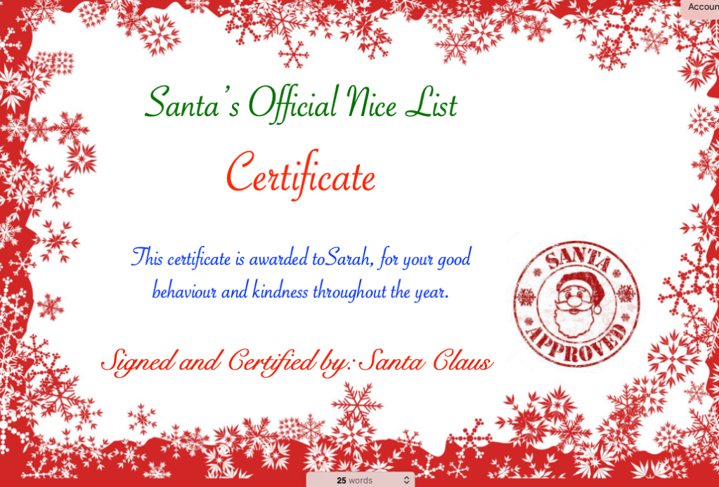 Customised Santa official nice list certificate from Santa.